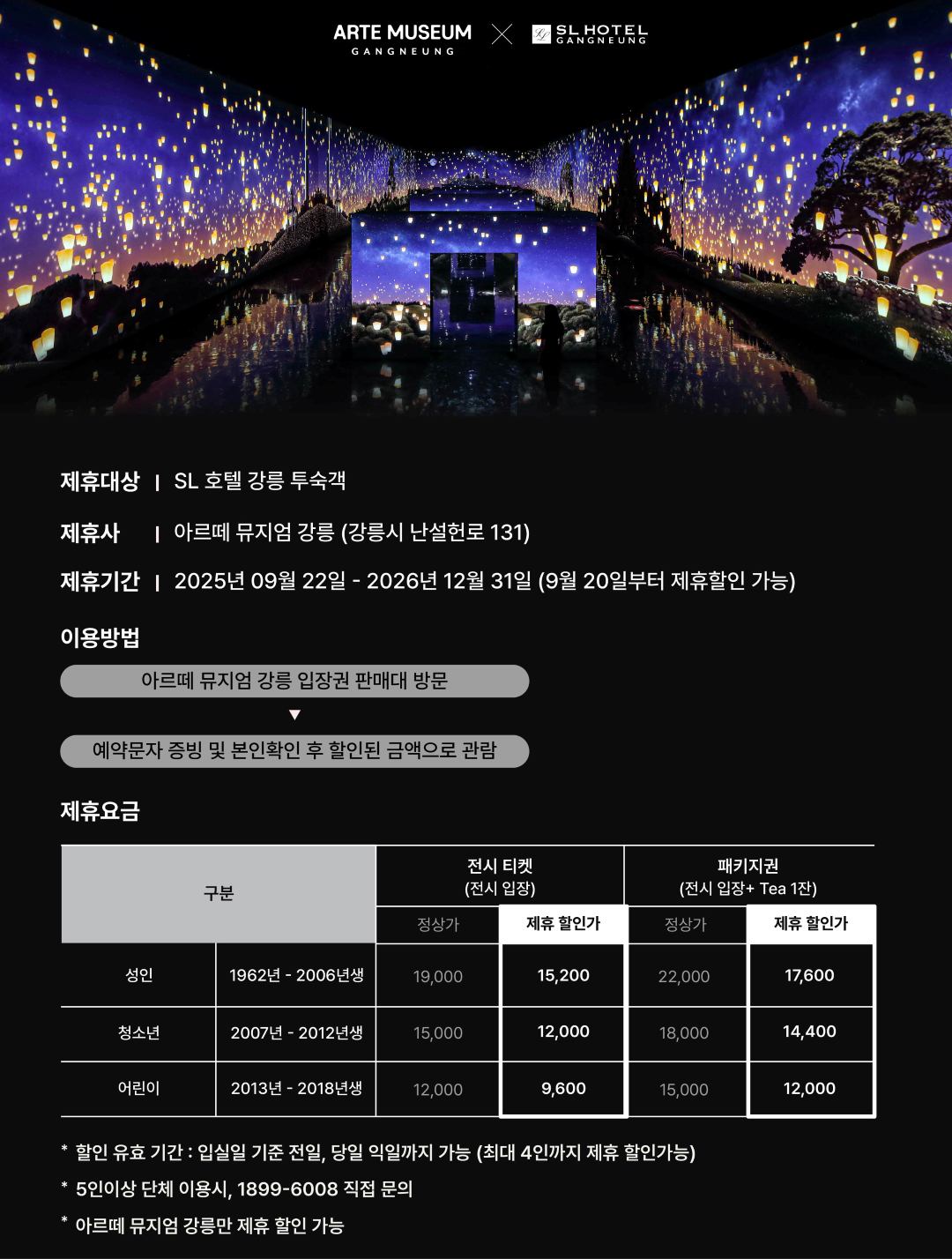 [제휴혜택] SL호텔 강릉 x 아르떼 뮤지엄 강릉 제휴 할인 최고관리자 2025-09-19 최고관리자 0 212 09.19 15:33 아르떼 뮤지엄 강릉에서전시 관람 20% 할인을 받으실 수 있습니다![이용 대상]SL호텔 강릉 투숙 고객[제휴 장소]아르떼 뮤지엄 강릉(가릉시 난설헌로 131)[제공 혜택]전시 티켓 20% 할인 적용※ 할인 유효기간 : 입실일 기준 전일, 당일 익일까지 가능 ※ 5인이상 단체 이용시, 1899-6008 직접 문의※ 아르떼 뮤지엄 강릉만 제휴 할인 가능